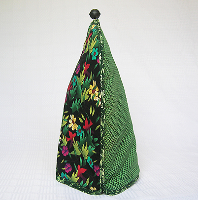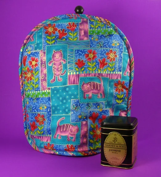 Each Thinsulate insulated Kozee is designed with four different fabrics. There is one print for the front, one for the back, a contrasting fabric for bias binding, and lining fabric for inside. Some people set the Kozee on the counter top. After a few days or weeks, they turn the Kozee around for a new look!