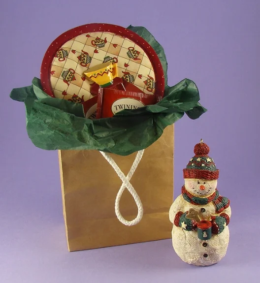 You can use small paper gift bags in solid colors or with creative drawings that fit the Kup Kaps. Add Twinings tea bags which come in a variety of colors to match the Kap fabric. You’ll have a cute inexpensive gift any tea drinker would love to have.