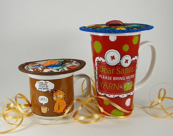 A mug for knitters and crocheters with a Yarn Skeins Kup Kap.