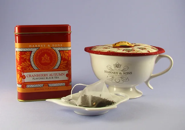 A tea tin filled with one of Harney & Sons flavorful teas and a delicate tea cup with a Tiny Teapots Kup Kap.