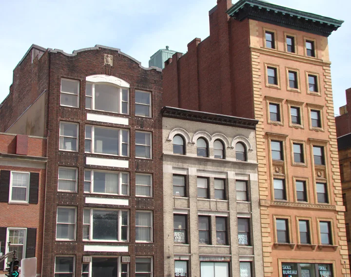These buildings show a time when city buildings had a look of their own in color, architecture style, and size.