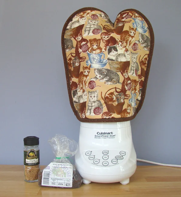 I found a great German mustard recipe. After following the easy directions, I poured the mixture and vinegar into my Cuisinart SmartPower Duet blender, where it needed to sit for 24 hours before blending. I put the lid on the blender, but it didn’t stop the pungent odor of vinegar from filling the kitchen. I set my little gray cells to work trying to solve the problem. I thought of my coffee cozy for our French press, put it over the blender, and stopped the vinegar smell!