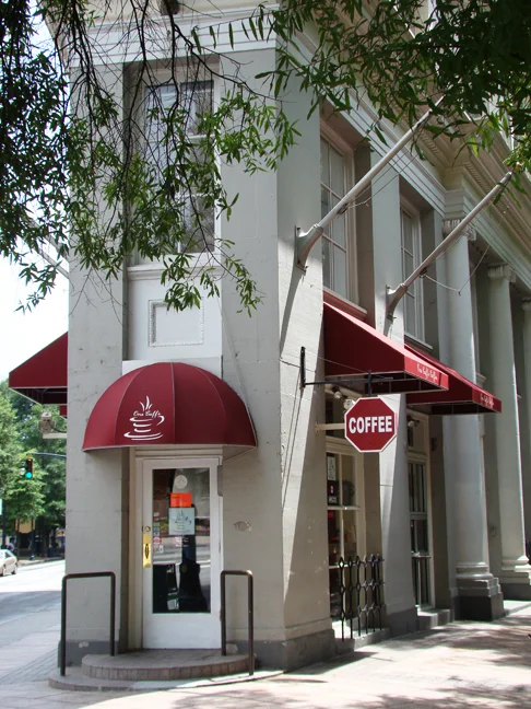 Caffe Coffee is inside the end of this unique building located on 84 Peachtree Street NW.