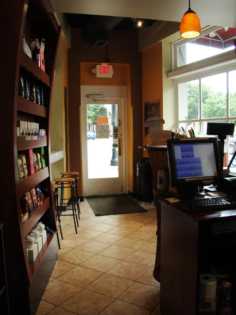 Even though the shop is small, it has a supply counter for napkins, flavorings, etc, several shelves of retail, and a window counter to sit at for a view of the street and shops. I didn’t feel cramped or crowded. The two young ladies were very friendly and agreeable to my photo shoot.