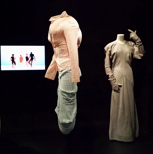 These outfits are only a few of the 70 for you to enjoy their uniqueness of design, colors, and use of textures. Scattered among the clothing are unusual chairs. If you love clothes, see this exhibit!