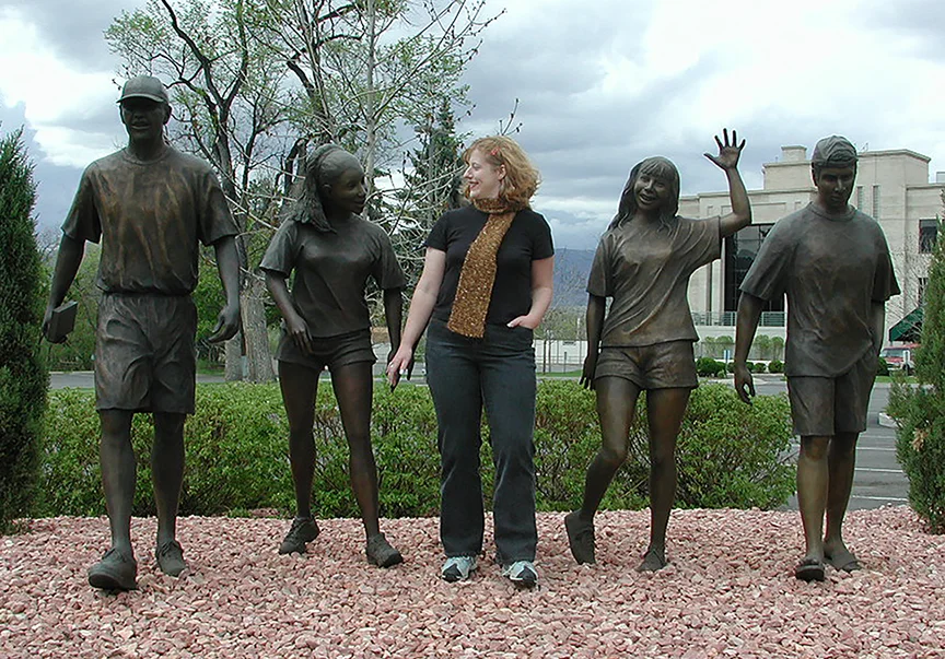 I always take photos of my knitting projects. Three years ago after finishing a scarf for Colleen, we went downtown to Colorado Springs to shoot photos and walk. I parked in the usual block on Cascade Ave next to this sculpture. It's called"The Best Week of our Life" by David Spellerberg, founder of National Heritage Collectors Society in California.
