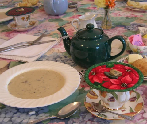 We ate lunch at the Edinburg Antiques and Tea Rooms. Because it was near the holidays, Perry and I used our holiday Kup Kaps (cup lid) on our delicate cups and saucers to keep the flavorful tea hot.