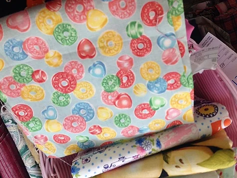 Colleen lives near a fabric store in Tokushima, Japan. When she described the store, I asked her to email photos. The fabrics are stacked high and in piles close to each other. Small cuts of fabrics are in baskets and bins.