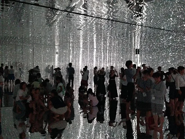 “Viewers are invited to enter and walk around within the three-dimensional light space. This movement affects the light particles and creates changes in the installation. Viewers can also interact with the work by using their smartphones to select elements that make up the Crystal Universe.”