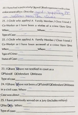 Early on a Monday morning I went to the county courthouse for a jury duty summons. The large room was packed. After we checked in by name, we had to fill out a form and answer questions.