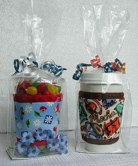 Enjoy an iced drink from your favorite coffee or tea shop, wash the container, and then use it for this easy gift idea! Slip a Kup Kollar on the drink container, tuck the hang-tag label out of sight under the cup wrap, pour in matching colorful candies, add silk flowers, put on the lid, wrap in clear plastic, and tie with colorful ribbons.